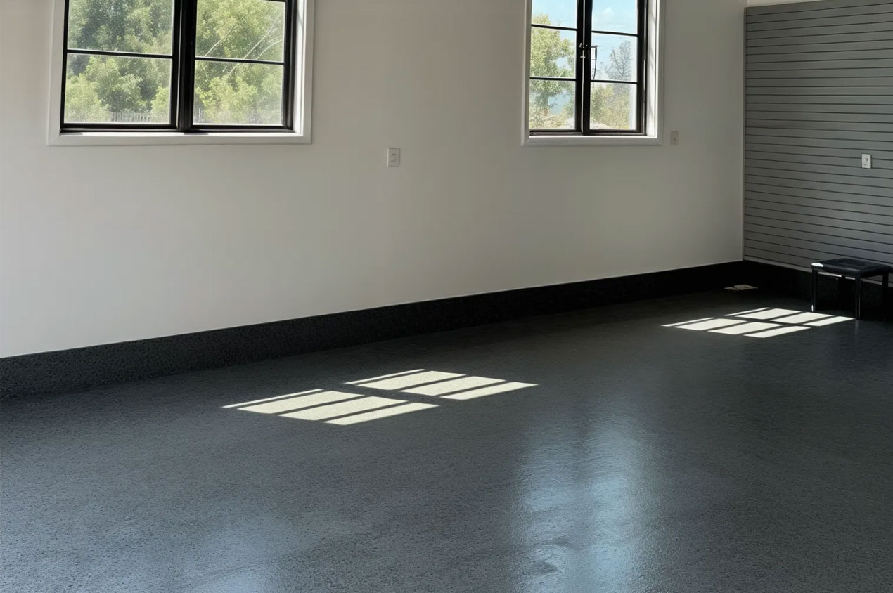 For added style and function, we offer decorative options such as metallic finishes, colored flakes, or quartz textures that enhance traction and design. Finally, a clear topcoat is applied to protect against chemicals, abrasion, and UV exposure — leaving a glossy, easy-to-clean surface that lasts for years.